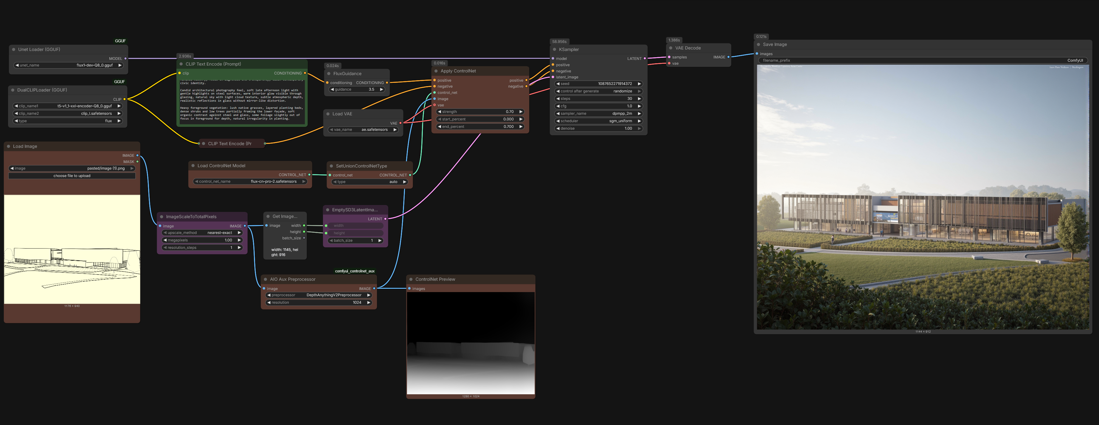 We are moving beyond standard AI novelties by developing custom workflows using ComfyUI. This visual programming interface allows us to build structured generation pipelines using advanced imaging models like Flux and Z-Image to rapidly produce detailed architectural concepts. Crucially, by integrating ControlNets, we anchor AI generated images directly to our own hand sketches and 3D models. This ensures the outputs remain strictly tied to our design intent, rather than producing generic imagery, allowing for rapid but highly controlled iteration.