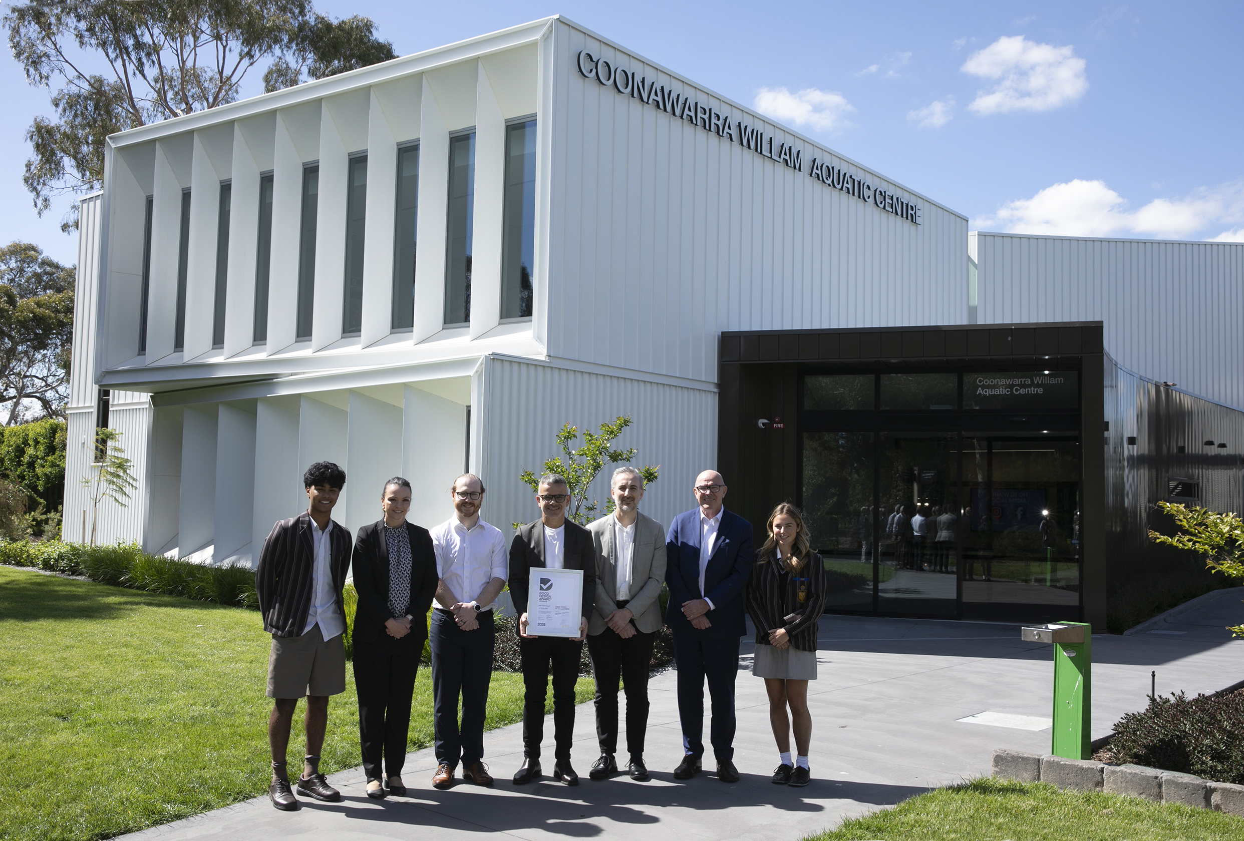 Peddle Thorp Architects visited Ivanhoe Grammar School to present the certificate for the 2025 Australian Good Design Award, recognising the Coonawarra Willam Aquatic Centre. The award reinforces the value of a clear brief, disciplined collaboration, and a shared determination to create environments that advance wellbeing and learning.