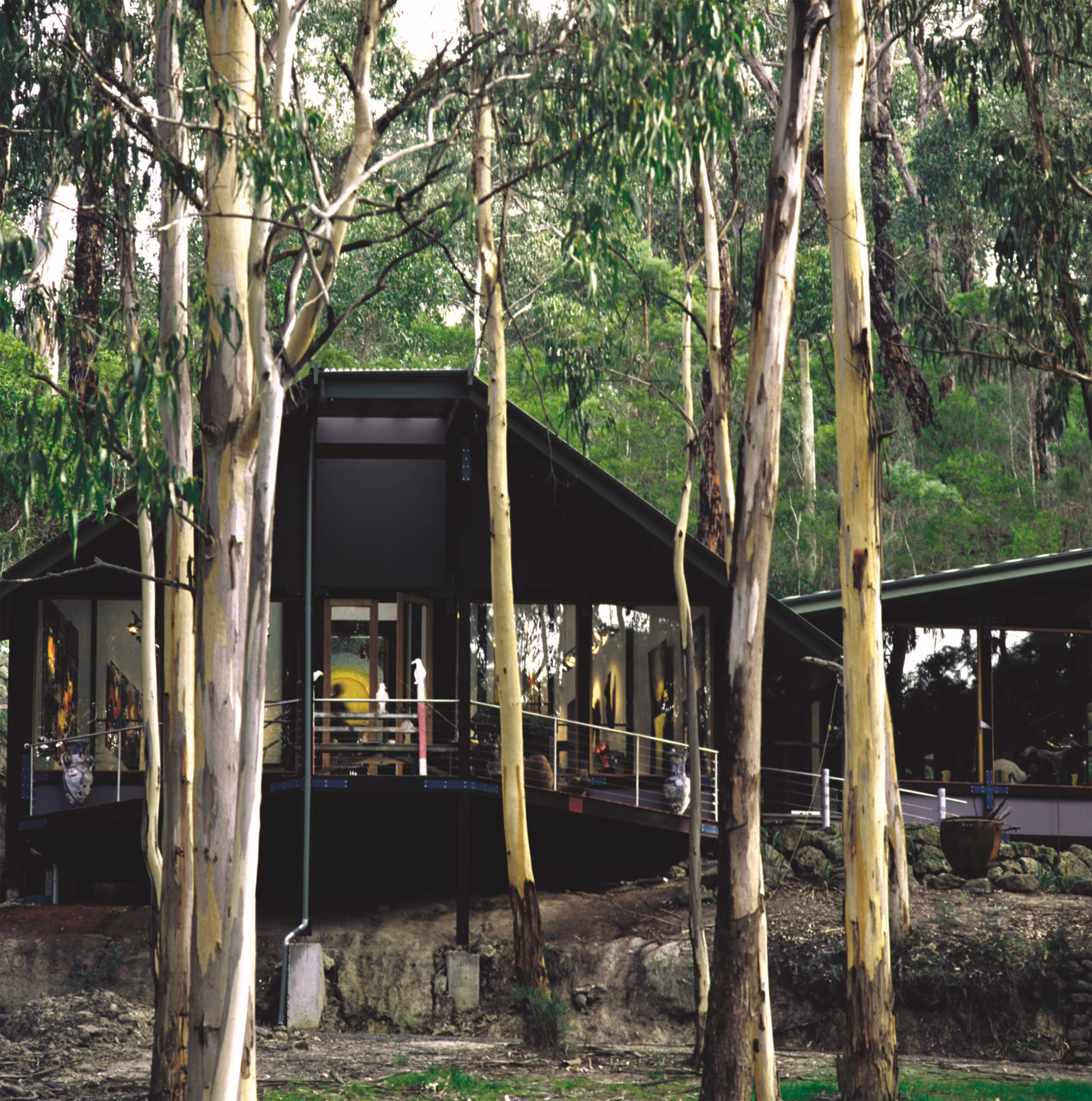 Set among the gum trees in Lorne, Qdos Gallery offers a unique setting for sculptor Graeme Wilkie to work on his own commissions as well as creating a centre for an artistic community. We worked closely with the client, artist Graeme Wilke to ensure that the highly sculptural form was in harmony with the surroundings. Light is also a theme in the gallery with lofty rooflines and glass to draw in the bushland views and the grounds form a natural amphitheatre watched over by the gallery and treehouses.